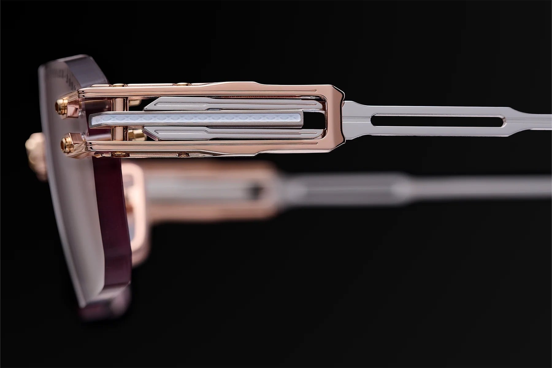 高品質なチタン製のブリッジに手作業で装飾されたエナメルのディテールが美しい仕上がりで、技術的な強度と芸術性が融合しています。