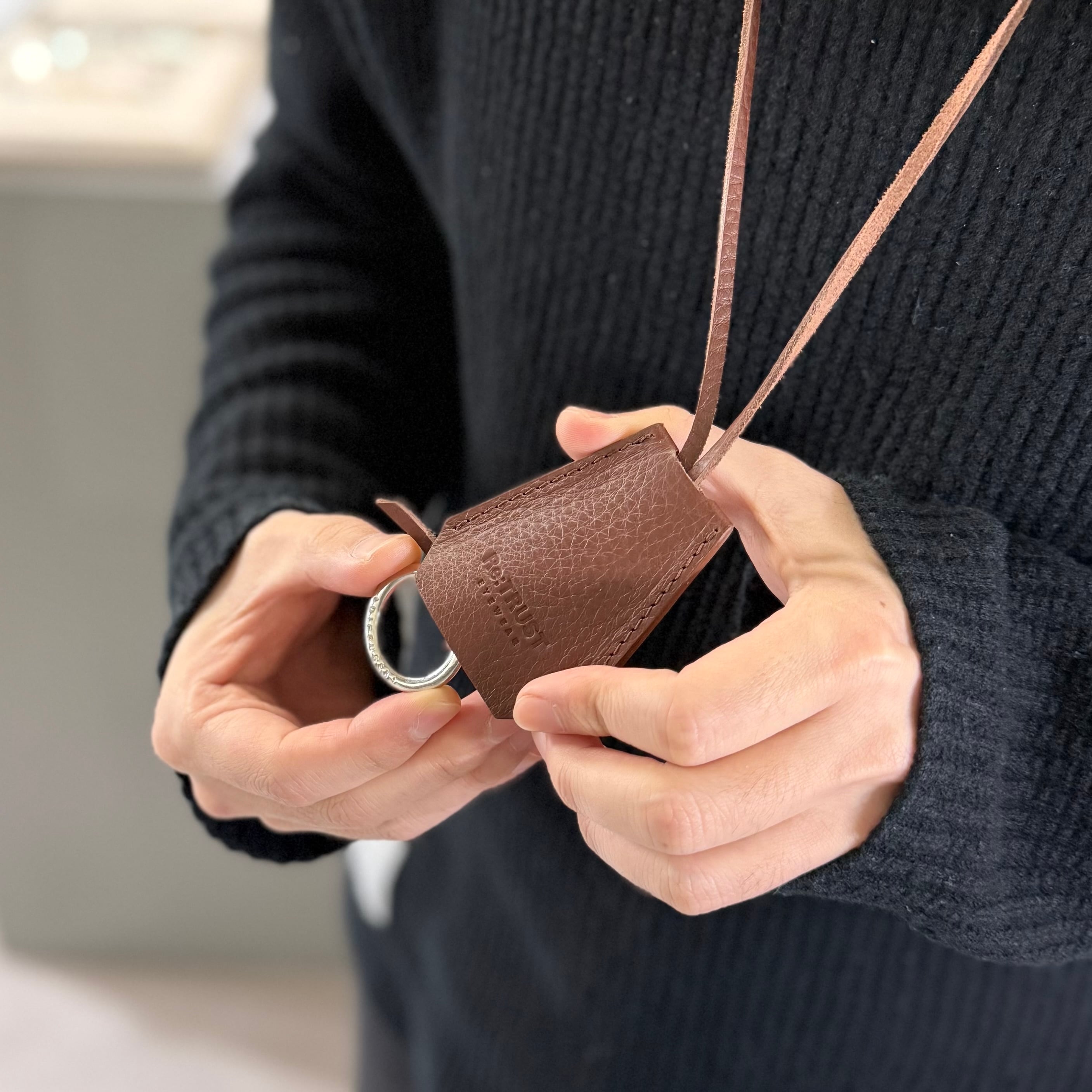 柔らかなイタリアンレザーは、使用を重ねるごとに経年変化が起こり、味わいが増していきます。アイウエアを掛ける時は鐘を上方へスライドしてリングを取り出して下さい。