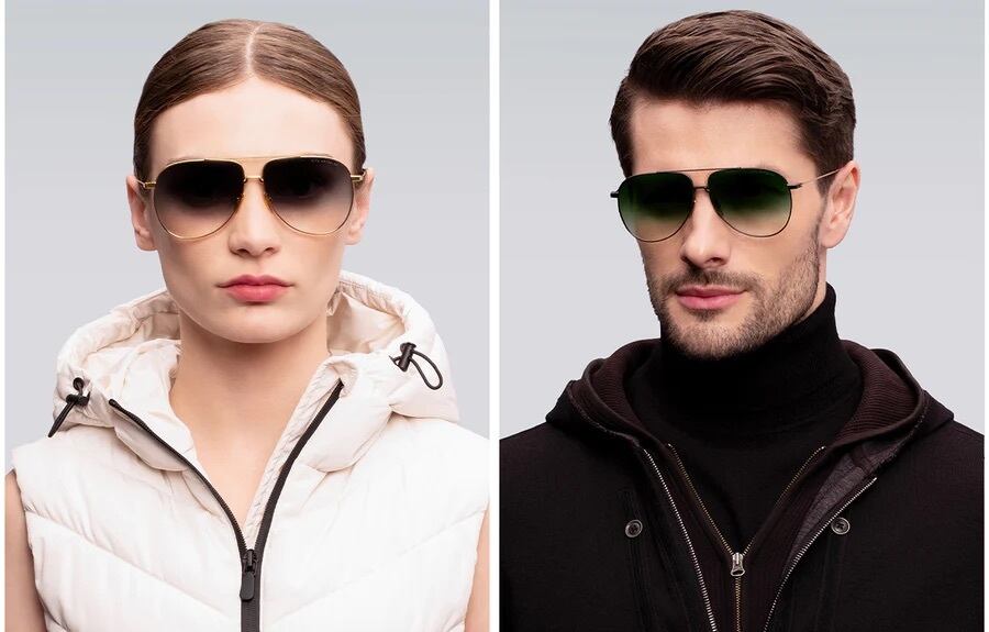 レンズカラーとテンプルエンドのカラーリングの組み合わせで上品さと高級感を演出。